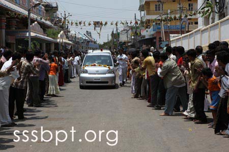 At 11.15, the special aircraft touched down at Puttaparthi Airport. Agninakshatram is scorching the rocky terrain but no one seems to care. Devotees are thronging either side of the road as the motorcade passes along, drenching everyone with happiness.